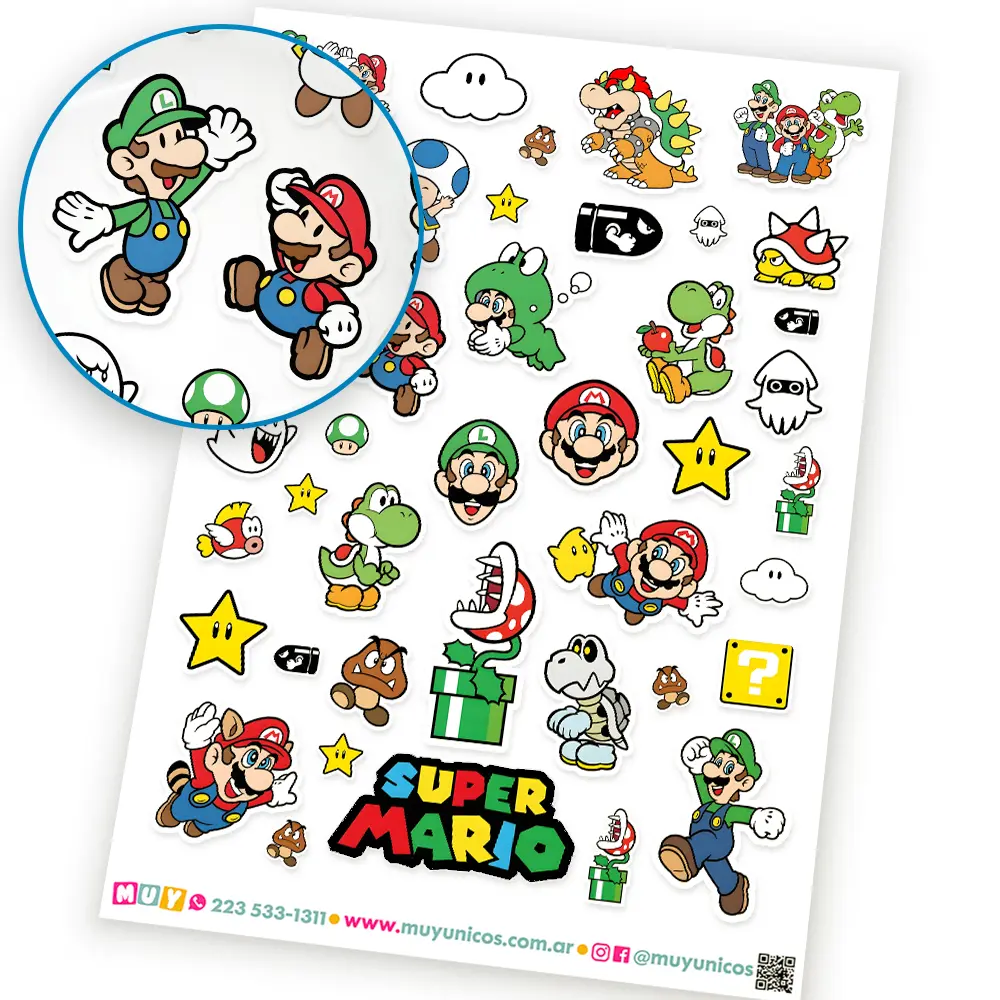 Plancha de Stickers de Mario Bros. Vienen impresos en papel fotográfico adhesivo y troquelados, listos para pegar donde quieras. ⭐La planchas trae 42 stickers con diferentes diseños ⭐Tinta resistente al agua y al alcohol ⭐Se puede pegar en cualquier superficie